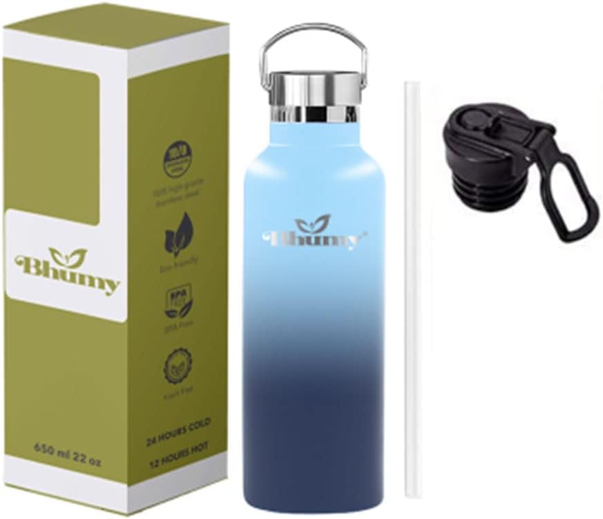 Bhumy Stainless Steel Water Bottles β 22oz Double Wall Stainless Steel Insulated Water Bottle β Water Bottle with Straw and 2 Lids β Leakproof Sports Water Bottle Water for Gym, Office, Travel