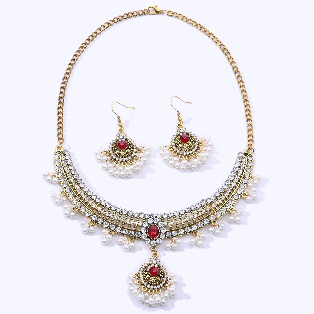 Indian Ethnic Bronze Plate Vintage Jewelry Set For Women Wedding Simulate Pearl Tassel Drop Earrings Red Crystal Choker Necklace